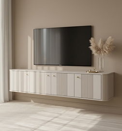 RTV skrinka Asha 200 cm ryhovaná s výklenkom a kovovým rámom - dub artisan / čierny mat