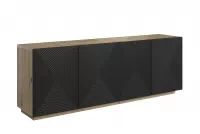 Komoda Asha je vyrobená z kvalitných materiálov, ako sú laminovaná doska a doska MDF, ktoré zaručujú jej dlhú životnosť a odolnosť. Jej rozmery 200 x 71 x 43 cm, štyri dvere a štyri police poskytujú dostatok úložného priestoru pre všetky vaše potreby.