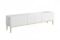 Elegantné línie, matná biela farba a dizajnové zlaté nožičky vytvárajú harmonický celok, ktorý okamžite upúta pozornosť. Minimalistický vzhľad sa ľahko kombinuje s rôznymi štýlmi interiéru – či už preferuješ čistý škandinávsky štýl, glamour alebo nadčasovú klasiku, tento kúsok sa stane dominantou tvojej obývačky. Frézované predné plochy dodávajú nábytku originálny charakter a pocit luxusu.