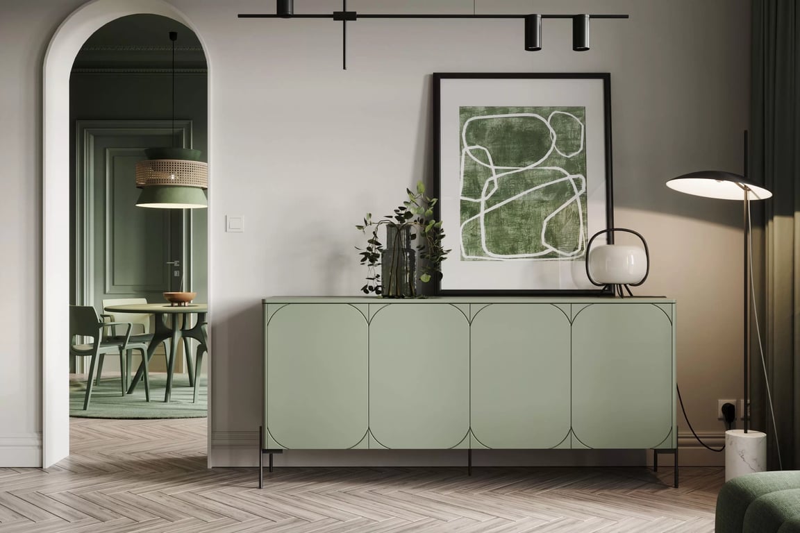 Táto komoda vás okamžite upúta svojím moderným dizajnom a elegantnou olivovou farbou. Jej čierne kovové nožičky dodávajú celkovému vzhľadu šmrnc a sofistikovanosť. Predstavte si, ako tento nábytok oživí váš obývací priestor a stane sa jej dominantou.