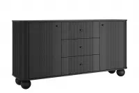 Táto komoda prináša eleganciu a sofistikovanosť do každého priestoru. Jej čierne prevedenie dodáva miestnosti nádych luxusu a modernosti, zatiaľ čo frézovaná predná časť pridáva unikátny dizajnový prvok. Čierne guľové nohy dodávajú komode vzdušnosť a ľahkosť, čo ju robí ideálnou pre moderné a minimalistické interiéry.