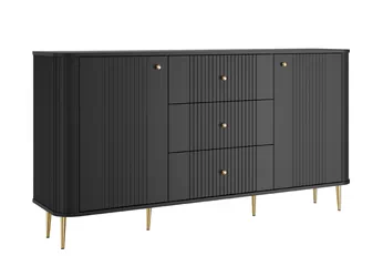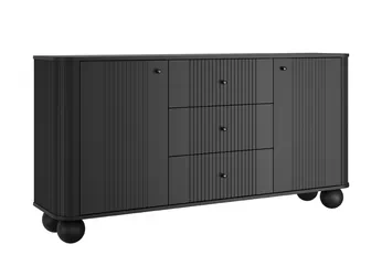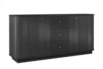 Elegantný čierny povrch v kombinácii s frézovanými prednými časťami vytvára jedinečný vizuálny dojem, ktorý okamžite upúta pozornosť. Minimalistické línie a matné kovové úchytky podčiarkujú nadčasový charakter, vďaka čomu sa komoda stane neprehliadnuteľným prvkom každého moderného interiéru.
