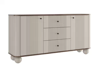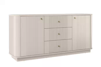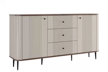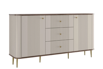 Unikátny vzhľad tejto komody zaujme už na prvý pohľad. Kombinácia kašmírovej farby s výraznou doskou v dekore orecha a zlatými kovovými úchytkami vytvára luxusný dojem, ktorý vnesie do priestoru teplo aj noblesu. Frézované predné časti a zaoblené hrany podčiarkujú moderný dizajn, ktorý sa ľahko prispôsobí rôznym štýlom zariadenia.
