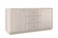 Okamžite zaujme moderným dizajnom, ktorý kombinuje jemný kašmírový odtieň s výraznými zlatými kovovými úchytkami. Frézovaná predná časť a zaoblené hrany pôsobia mimoriadne vkusne, vďaka čomu sa komoda stane dominantným prvkom každého priestoru. Sokel dodáva nábytku ľahkosť a zároveň podčiarkuje jeho nadčasový charakter.