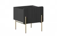 Elegantné spojenie čierneho matného korpusu a zlatých kovových nožičiek okamžite pritiahne pozornosť a dodá vašej spálni nádych luxusu. Minimalistická frézovaná predná časť bez úchytky pôsobí čisto a moderne, takže stolík ľahko zapadne do každého interiéru, ktorý chcete oživiť vkusným akcentom.