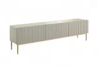 Moderný vzhľad, ktorý okamžite upúta pozornosť – matný kašmírový povrch pôsobí príjemne sofistikovane a frézovaná predná časť dodáva nábytku osobitý charakter. Zlaté kovové nožičky vnesú do priestoru nádych luxusu a vďaka ich výške pôsobí celá skrinka ľahko a vzdušne. Čisté línie a elegantná farebná kombinácia sa perfektne hodia do každého moderného interiéru.