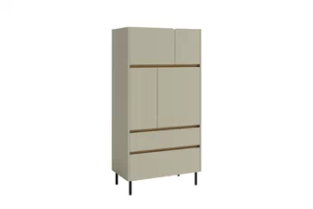 Stabilná konštrukcia z laminovanej dosky hrubej 16 mm zaručuje dlhodobú odolnosť aj pri každodennom používaní. ABS hrany s hrúbkou 0,8 mm chránia pred poškodením a predlžujú životnosť nábytku. Štyri dvierka a štyri poličky poskytujú prehľadné rozdelenie priestoru, zatiaľ čo kovové a drevené rúčky uľahčujú manipuláciu. Guľôčkové výsuvy zásuviek zaisťujú hladké otváranie a zatváranie. Zadná časť z HDF dosky zabezpečuje pevnosť a stabilitu.