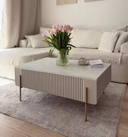 Stabilná konštrukcia z kvalitnej laminovanej dosky a MDF s hrúbkou 16 mm zaručuje dlhú životnosť a odolnosť voči poškodeniu. Zaoblené hrany s povrchom ABS chránia pred nechcenými nárazmi a zároveň pôsobia veľmi sofistikovane. Vnútorný priestor je rozdelený na tri samostatné skrinky s jednou policou, čo poskytuje dostatok miesta na uloženie elektroniky, hier alebo kníh. Praktický otvor na káble vám umožní udržať poriadok a skryť nevzhľadné káble za skrinkou.