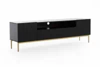 Hľadáš štýlový a praktický TV stolík, ktorý dodá tvojej obývačke luxusný vzhľad a zároveň ponúkne maximálnu funkčnosť? Objav RTV skrinku Nicole 200 cm s výklenkom a zásuvkami – čierny mat / zlaté nožičky, ktorá splní všetky tvoje očakávania.