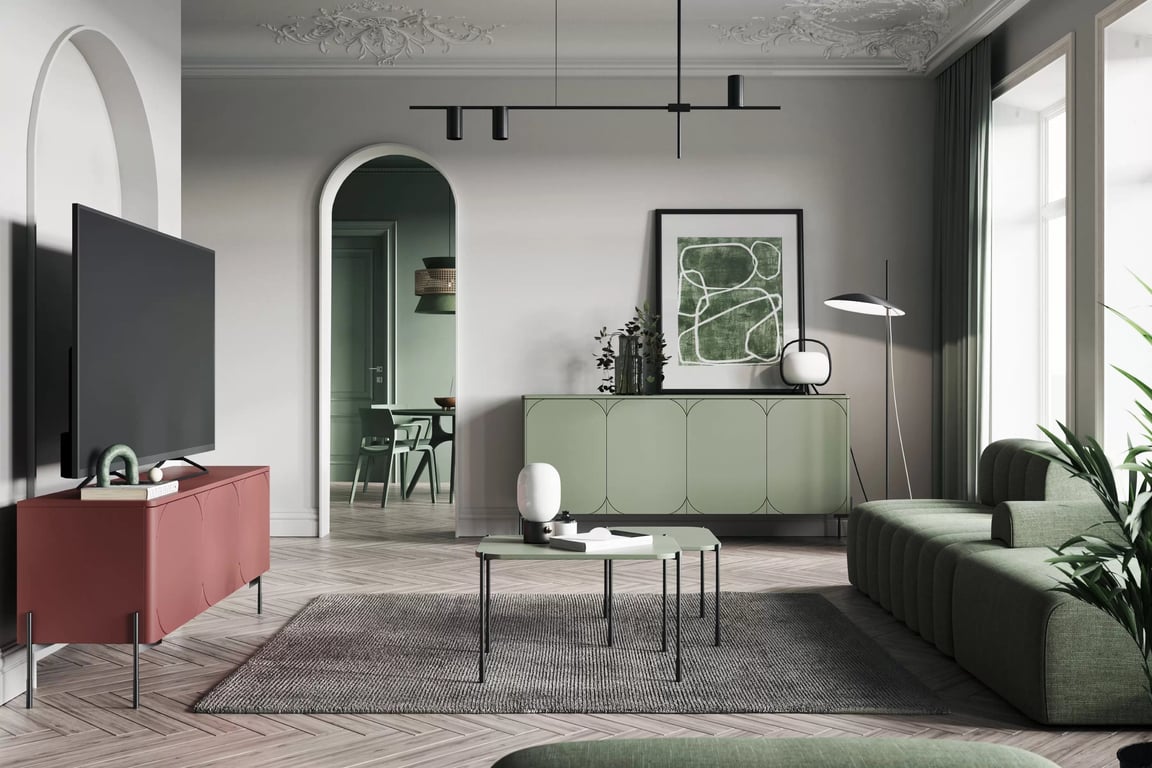 Tento burgundový TV stolík Sonatia je vynikajúci z hľadiska estetiky. Jeho burgundová farba a čierne nohy dodávajú šarm a eleganciu, ktoré vyniknú v každom interiéri. Má moderný dizajn, ktorý sa hodí do každej obývačky.
