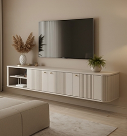 Závesná TV skrinka Asha 200 cm s drážkovanými dvierkami - kašmírová