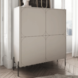 Vitrína Sonatia 100 - kašmírová je vyrobená z kvalitných materiálov. Korpus je vyrobený z 18 mm dosky MDF, predná časť je zo skla a nožičky sú kovové. Výsledkom je robustný a odolný kus nábytku, ktorý vydrží roky. Navyše, vitrína má oceľové závesy s tichým zatváraním a systém otvárania a zatvárania dvierok "push to open".